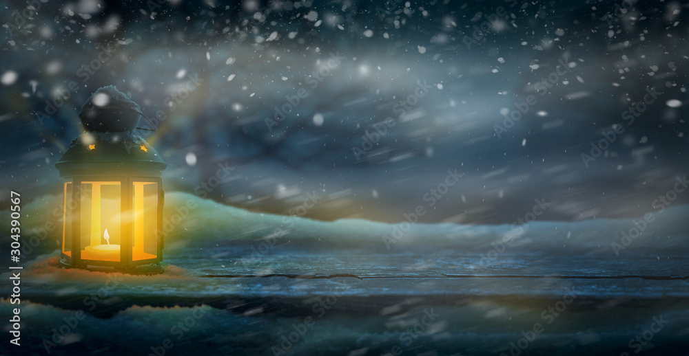 A Christmas winter woodland snowing scene with a warm glowing lamp on a wooden table at night.