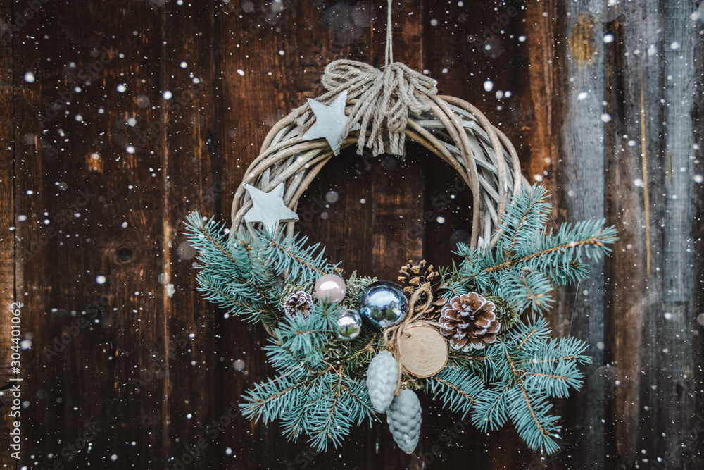 Christmas wreath on rustic wooden door background of blue tree.