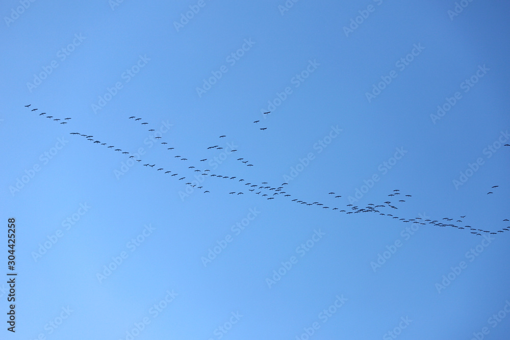 Many migratory birds fly to north at sunset