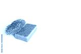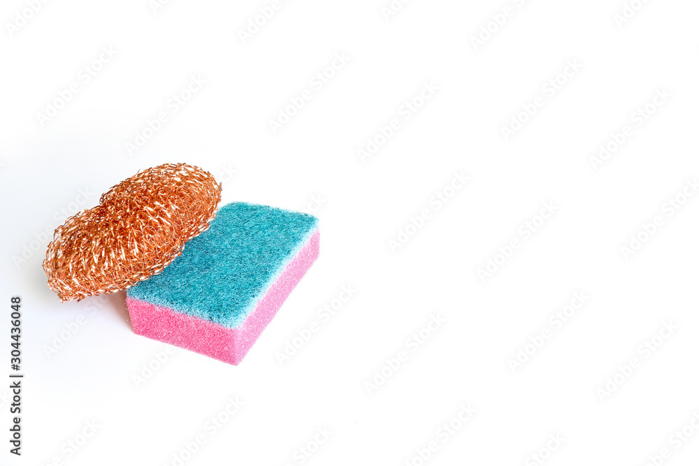 Kitchen sponge for dishes and a metal washcloth for complex dirt on a light background.