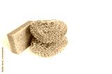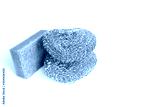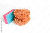 Kitchen sponge for dishes and a metal washcloth for complex dirt on a light background.
