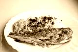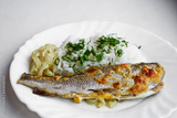 Baked fish with boiled rice and fried onions on a white dish. Healthy diet food.