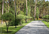 Path from paving slabs in a park among pines and spherical willows leading to a boarding house.