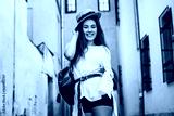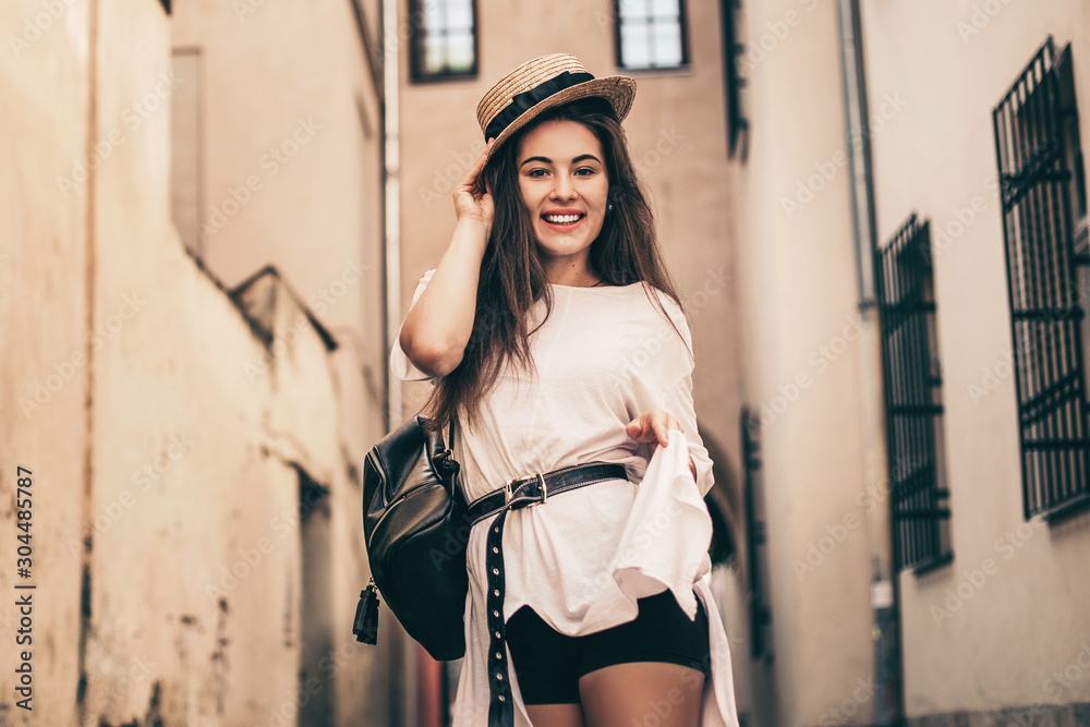 Young stylish woman walking on the old town street, travel with backpack, straw hat, wearing trendy outfit.