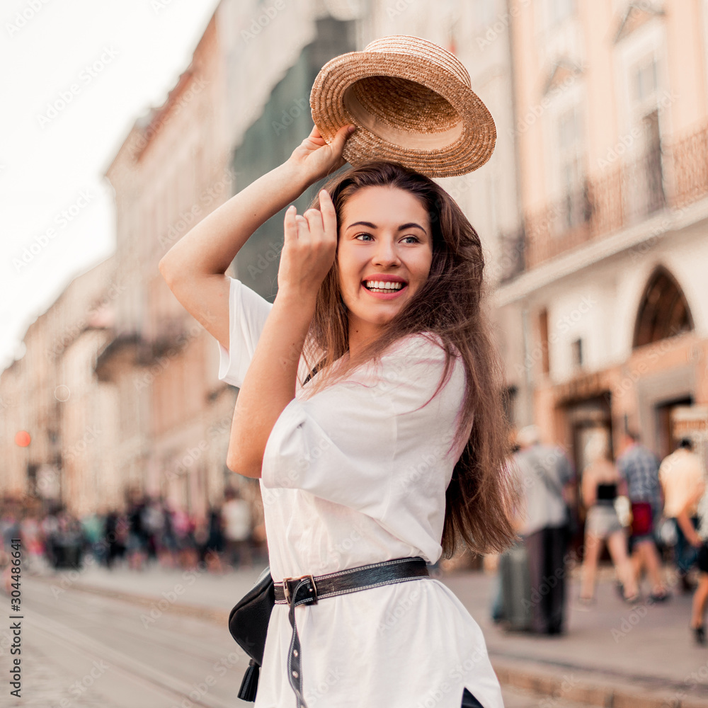 Young stylish woman walking on the old town street, travel with backpack, straw hat, wearing trendy outfit.