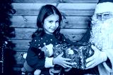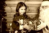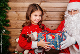 Santa Claus giving a present to a little cute girl near Christmas tree at home