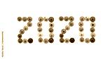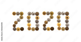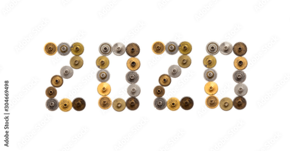2020 year concept. Vintage gears cogwheels steampunk style mechanical digits on white background. Rusty iron bronze metal textures. Aged mechanism wheels connection concept.