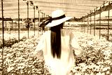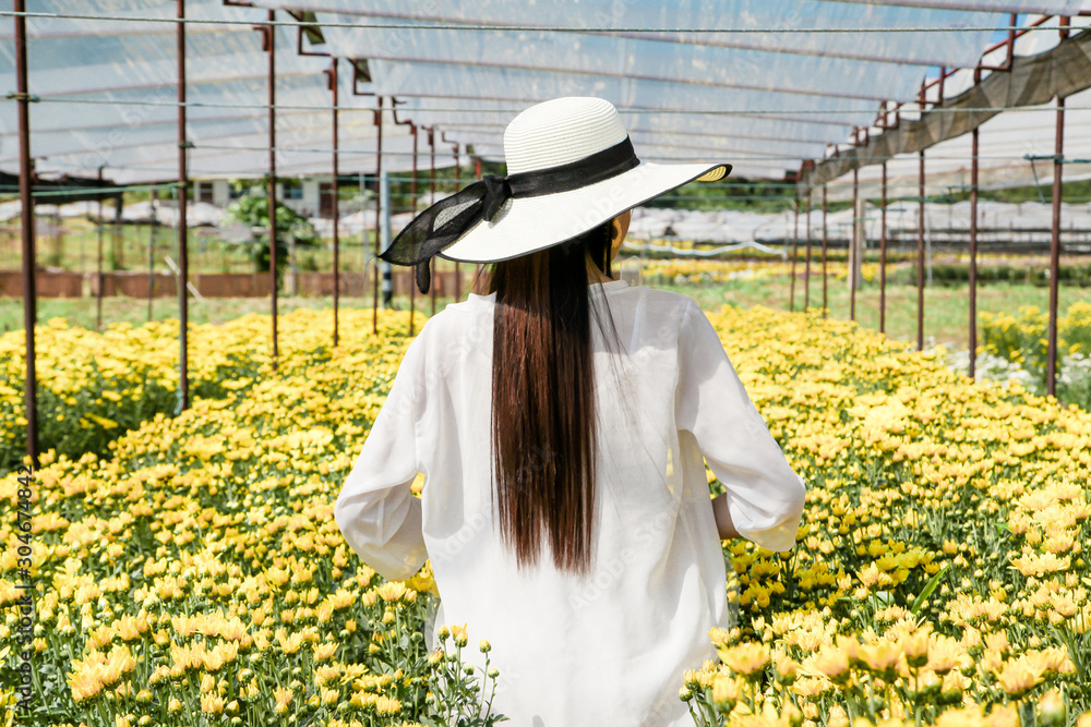Portrait young beautiful asian woman in white dress relaxing at chrysanthemum flower garden