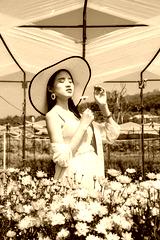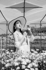 Portrait young beautiful asian woman in white dress relaxing at chrysanthemum flower garden