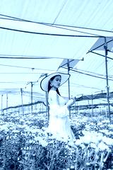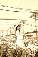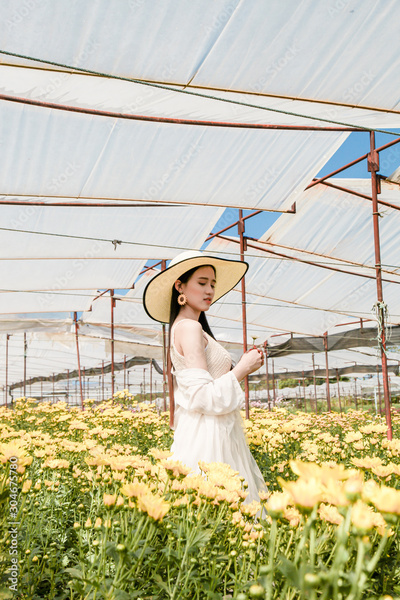 Portrait young beautiful asian woman in white dress relaxing at chrysanthemum flower garden