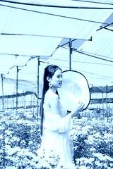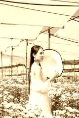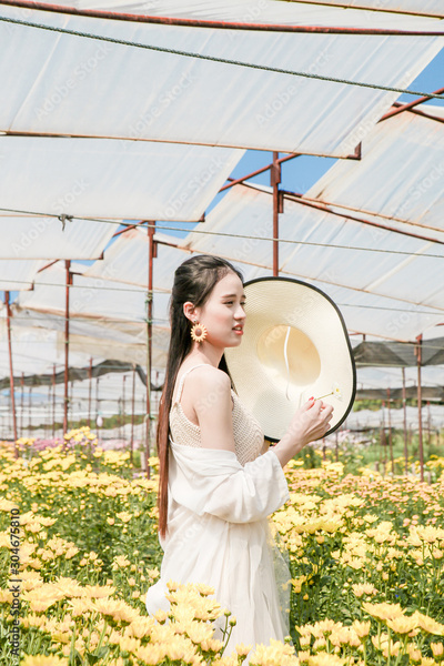 Portrait young beautiful asian woman in white dress relaxing at chrysanthemum flower garden