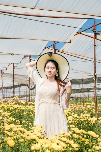 Portrait young beautiful asian woman in white dress relaxing at chrysanthemum flower garden