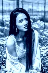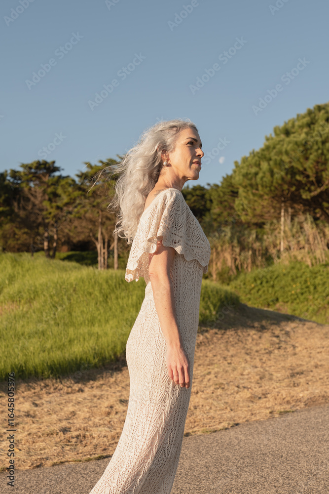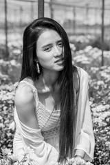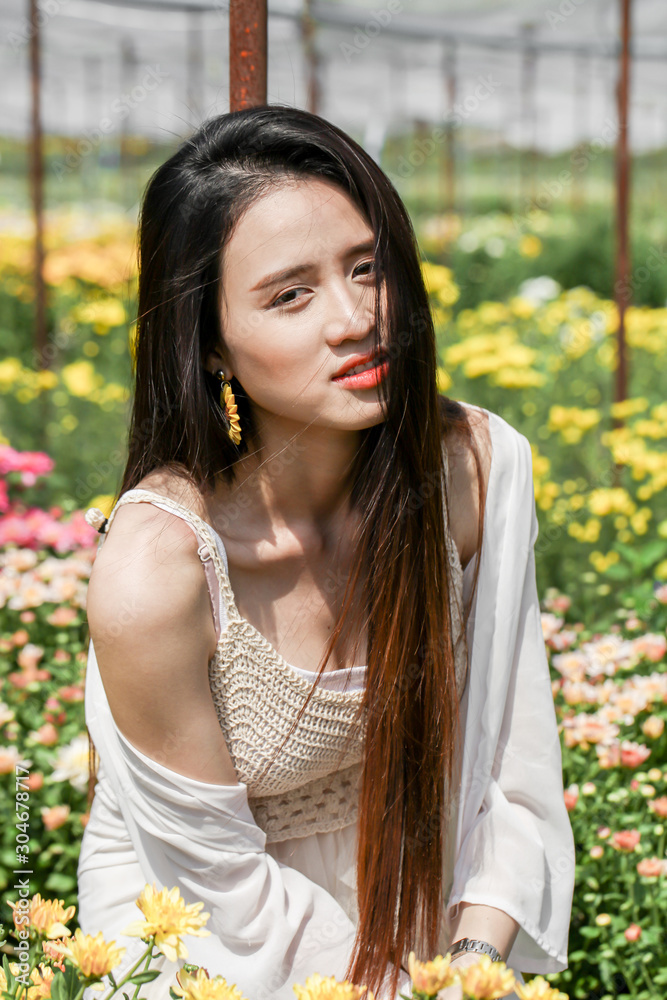 Portrait young beautiful asian woman in white dress relaxing at chrysanthemum flower garden