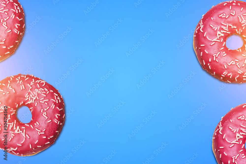 Fresh Donuts on Blue Background Close Up