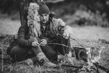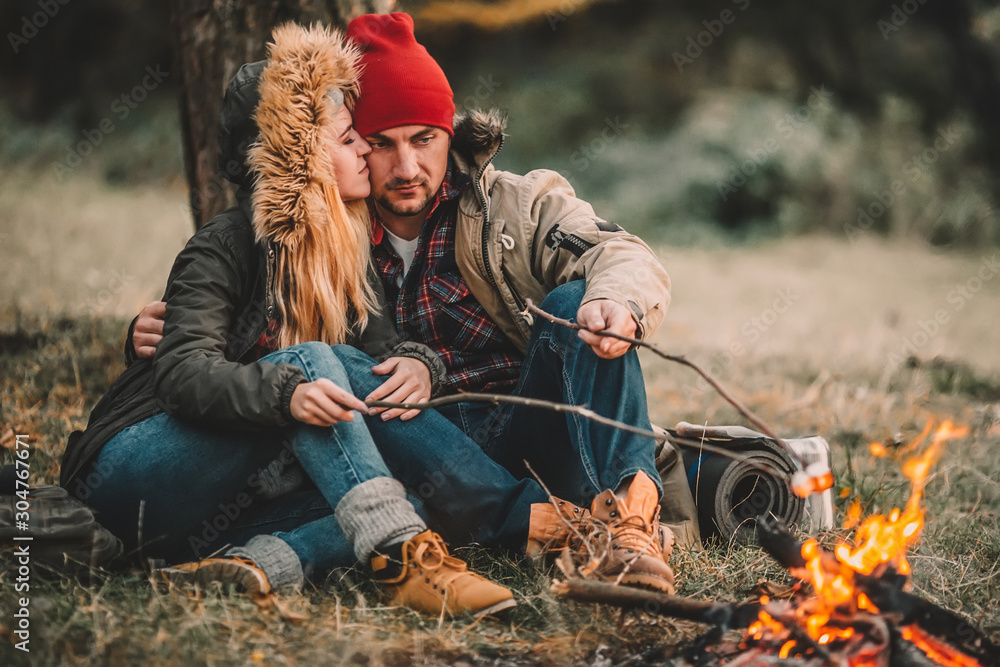 Traveler couple camping and roasting marshmallows over the fire in the forest after a hard day. Concept of trekking, adventure and seasonal vacation.