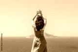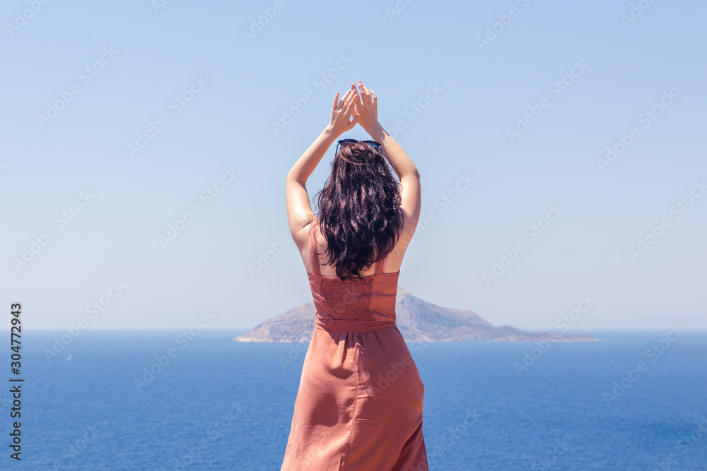 Young girl dancing on a background of blue sea and sky