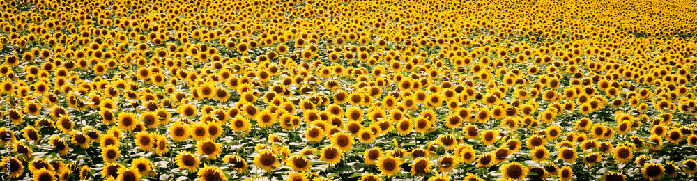 Sunflower field panorama. Nature landscape. Ripe sunflowers