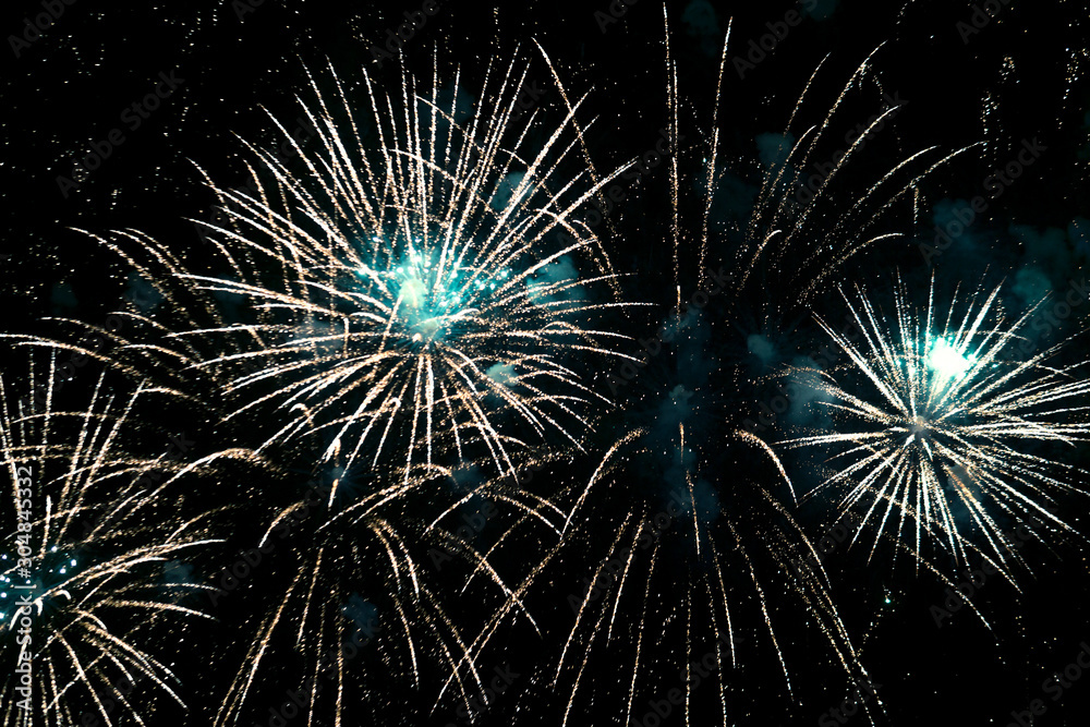 Bright blue fireworks in the night sky. New Year celebration