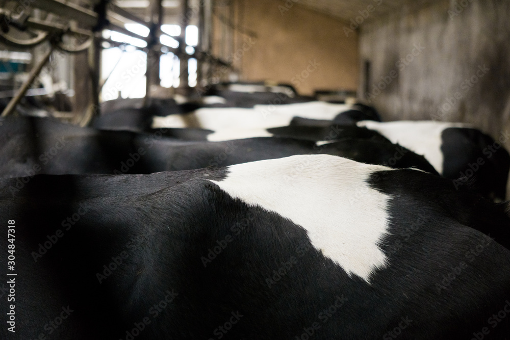 Many cows stand in a row, side view