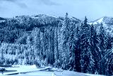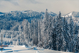 Beautiful view at winter mountains landscape with fir trees covered by snow. Vivid white spruces on a snowy day. Alpine ski resort. Winter greeting card. Happy New Year
