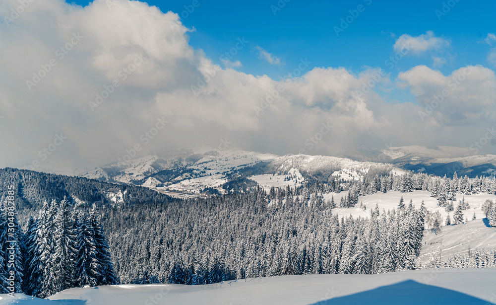 Beautiful view at winter mountains landscape with fir trees covered by snow. Vivid white spruces on a snowy day. Alpine ski resort. Winter greeting card. Happy New Year