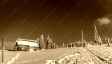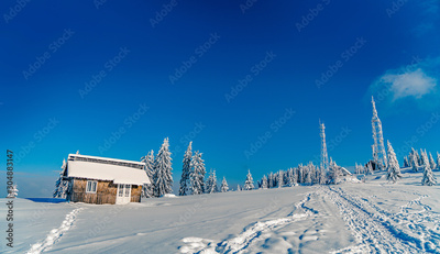 Beautiful snowy fir trees in frozen mountains landscape with house on north. Christmas background with tall spruce trees covered with snow. Alpine ski resort. Winter greeting card. Happy New Year