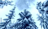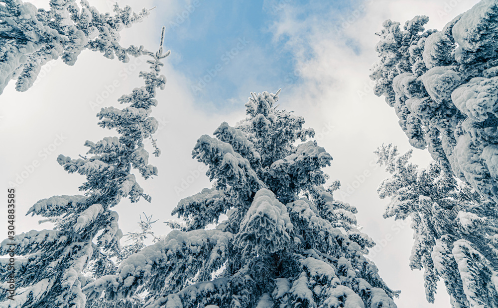 Tall spruce trees covered with snow in frosty winter landscape. A view on sky in snowy forest. Christmas background with fir tree, bottom view