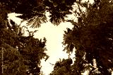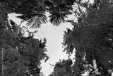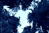 Tall spruce trees covered with snow in frosty winter landscape. A view on sky in snowy forest. Christmas background with fir tree, bottom view