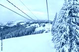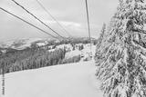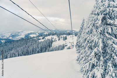 Ski elevator or funicular in snowy forest landscape winter. Panoramic view of frozen mountains background with fir trees covered by snow. Winter holiday and recreation on ski resort