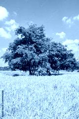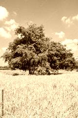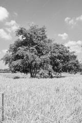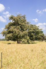 Tree,rice green fields and the sky background.