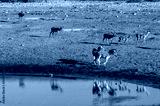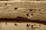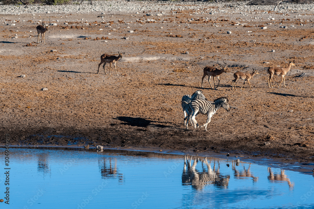 A group of Burchell's Plains zebra -Equus quagga burchelli- , together with a group of Impalas -Aepyceros melampus- standing close a waterhole on the plains of Etosha National Park, Namibia.