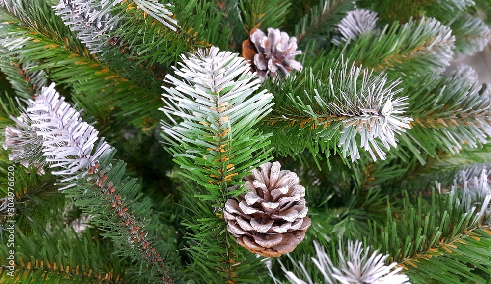 Artificial branches of an Christmas tree with snow and cones