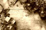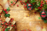 Christmas background with gift box, Christmas baubles, branches of holly and fir on wooden background. Winter festive concept. Flat lay, copy space.