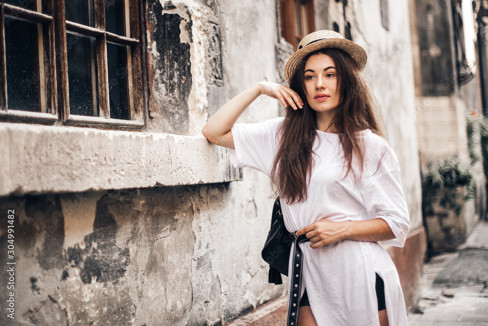 Young stylish woman walking on the old town street, travel with backpack, straw hat, wearing trendy outfit.