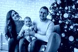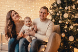 Happy family of mother, father and little baby boy hugging and celebrating new year in front of Christmas tree in decorated interior. Celebrating Christmas.