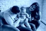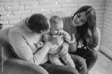 Happy family of mother, father and little baby boy hugging and celebrating new year in front of Christmas tree in decorated interior. Celebrating Christmas.