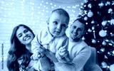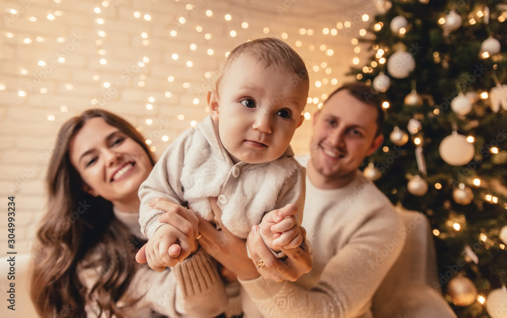 Happy family of mother, father and little baby boy hugging and celebrating new year in front of Christmas tree in decorated interior. Celebrating Christmas.