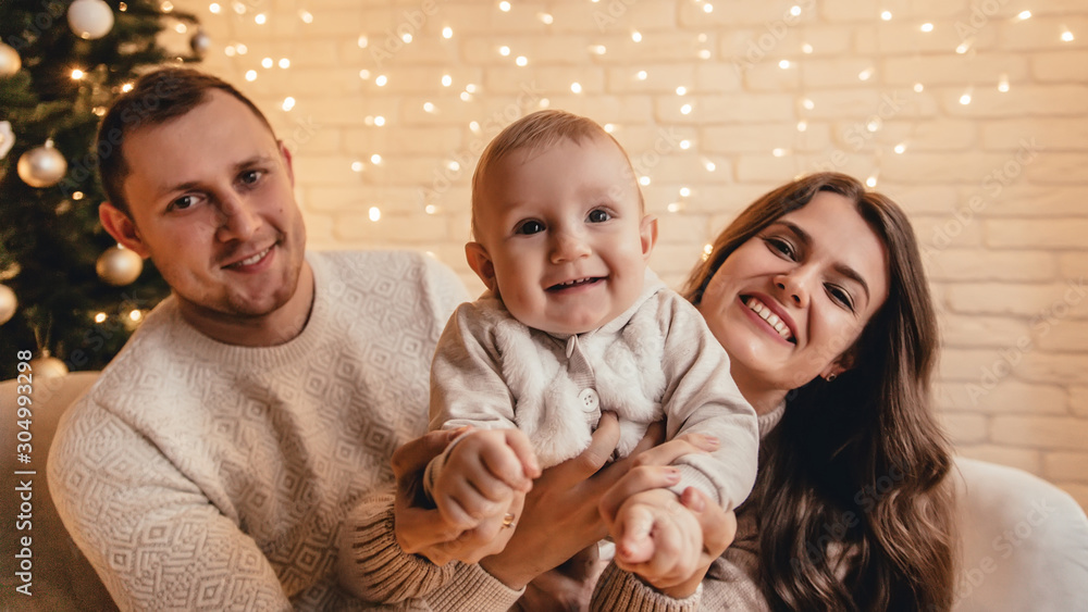 Happy family of mother, father and little baby boy hugging and celebrating new year in front of Christmas tree in decorated interior. Celebrating Christmas.