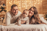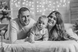 Happy family lie on the bed in decorated interior. Celebrating Christmas.