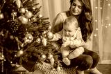 Mom with little baby decorating Christmas tree in room. Celebrating Christmas.
