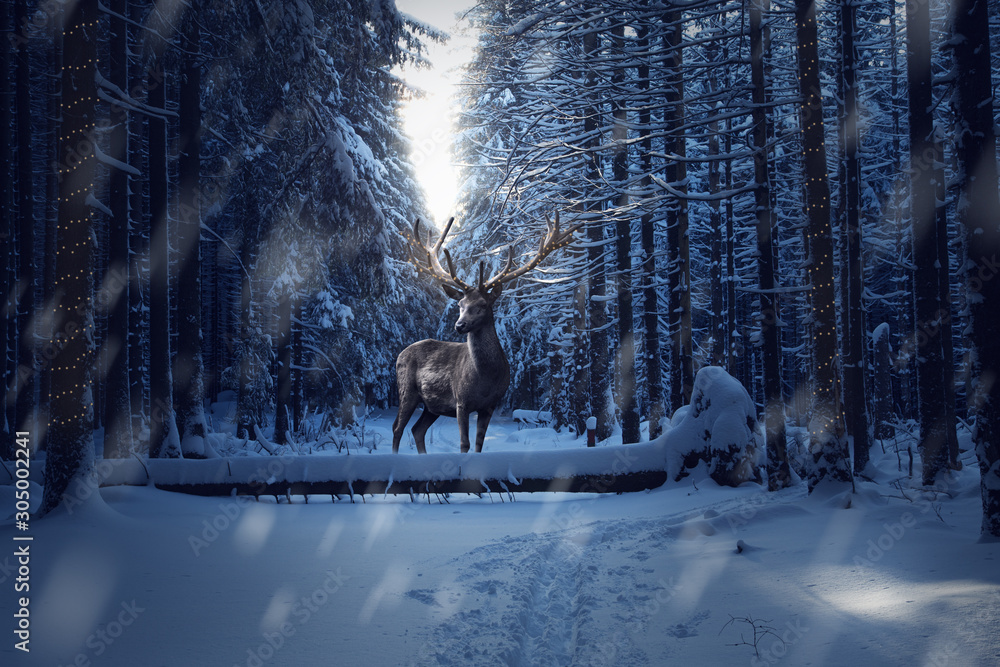 Hirsch steht in einem Winter Wald mit Schneefall. Lichterketten an den Bäumen und Geweih. Weihnachten.