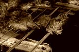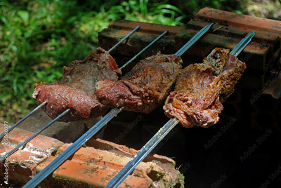 Traditional gaucho brick barbecue with meat on skewers in an outdoor area