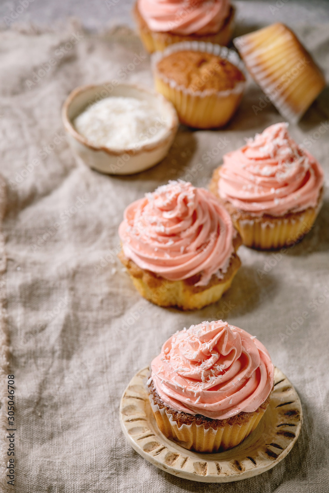 Homemade cupcakes with pink buttercream and coconut flakes served on ceramic plate on grey linen table cloth.