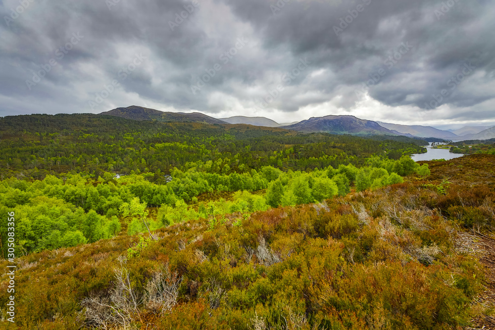 Picturesque landscape of a mountain forest with traditional nature of Scotland.