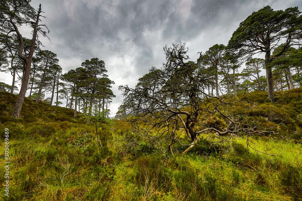 Picturesque landscape of a mountain forest with traditional nature of Scotland.
