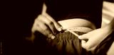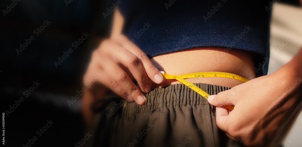 A healthy, fit girl measuring her waist after fitness exercise,Athletic slim woman measuring her waist