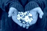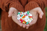 Many different pills in female hands. The concept of medicine, illness and pain.