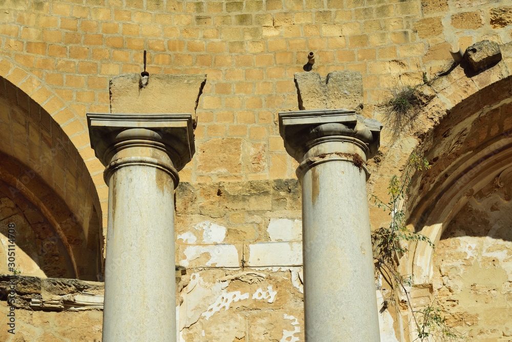 Historic ruin with old tall columns in greek architecture with old weathered stones in Sicily, Mazara del Vallo