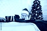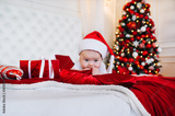 Adorable toddler boy in costume of Santa Claus hugging a red pillow