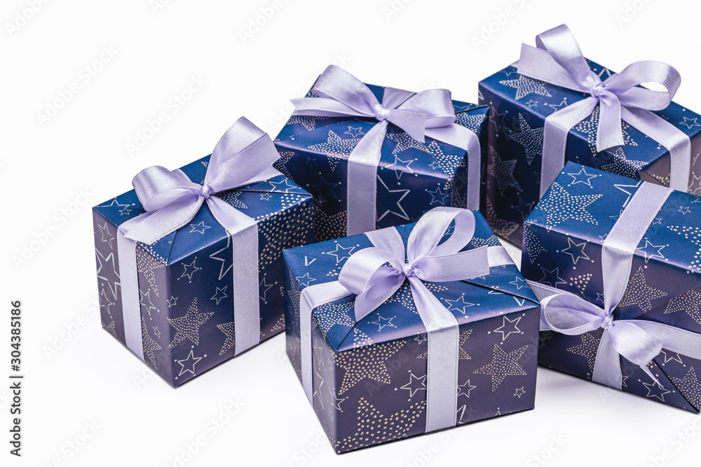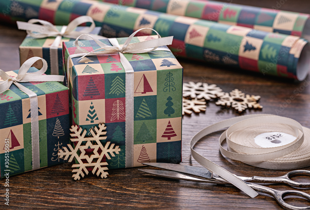 Christmas background with gifts boxes on wooden background. Preparing for the winter holidays. Copy space.
